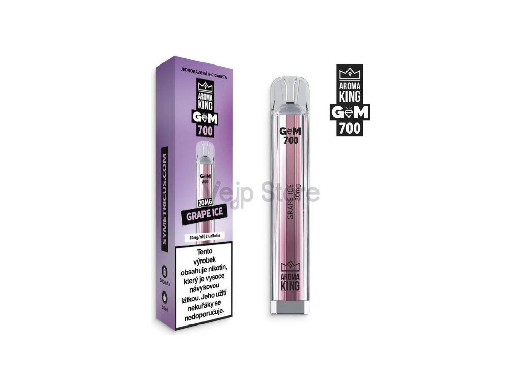 Jednorázová e-cigareta Aroma King Gem Bar 700 Grape Ice se sladkou chutí hroznového vína a ledově svěžími tóny.