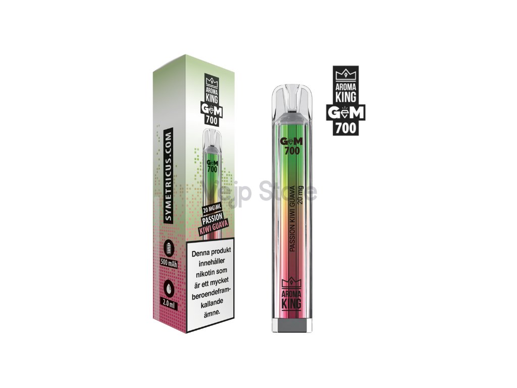 Jednorázová e-cigareta Aroma King Gem Bar 700 Passion Kiwi Guava s exotickou kombinací mučenky, zralého kiwi a sladké kvajávy.