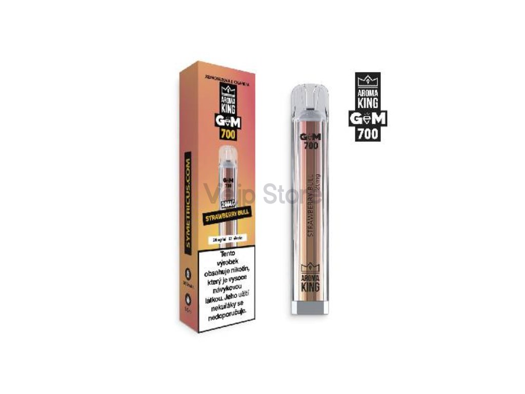 Jednorázová e-cigareta Aroma King Gem Bar 700 Strawberry Bull se sladkou chutí zralých jahod a výraznými tóny energetického nápoje.