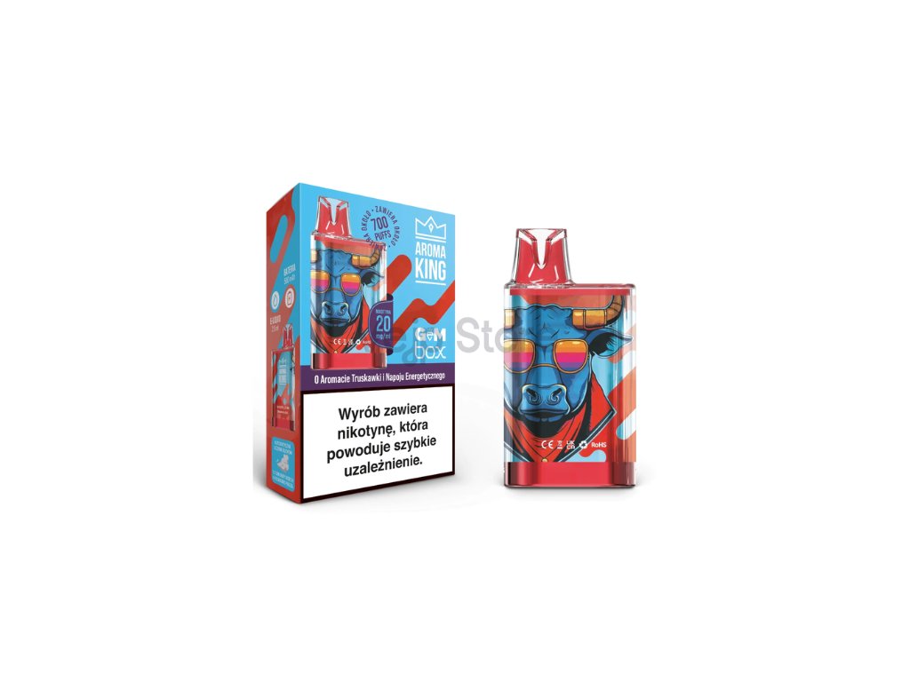 Vyzkoušejte naší jednorázovou e-cigaretu Aroma King Gem Box 700 Strawberry Bull s povzbuzující chutí jahodového energetického nápoje!